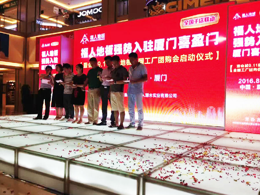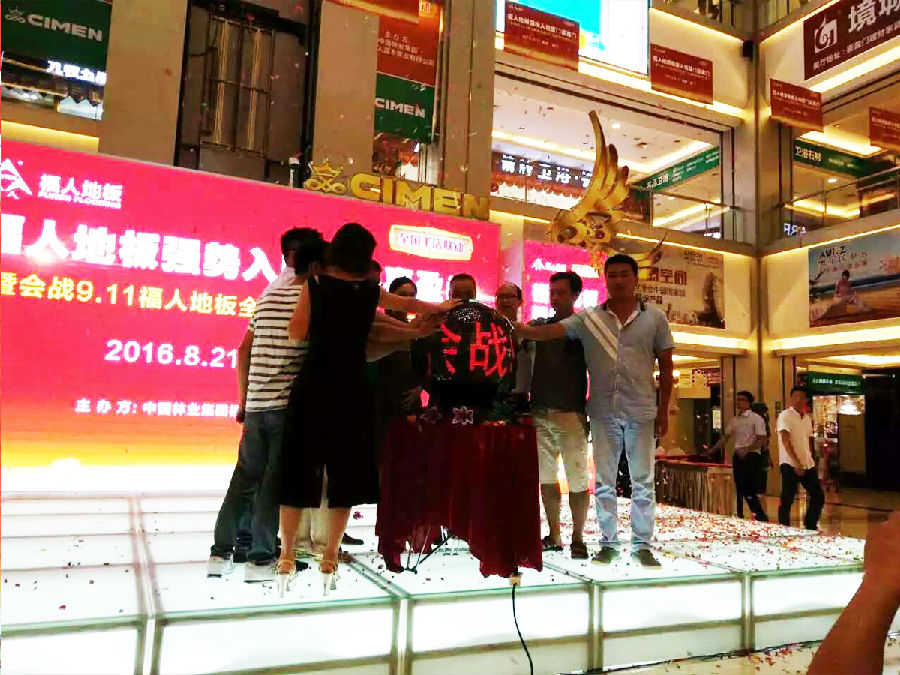 最后,由厦门喜盈门领导肖总、福建省产品质量检验研究所颜副所长、中林pg电子销售总监石总、经销商代表开启"会战9.11"启动球,预示着pg电子地板"会战9.11"全国千店联动正式拉开帷幕。