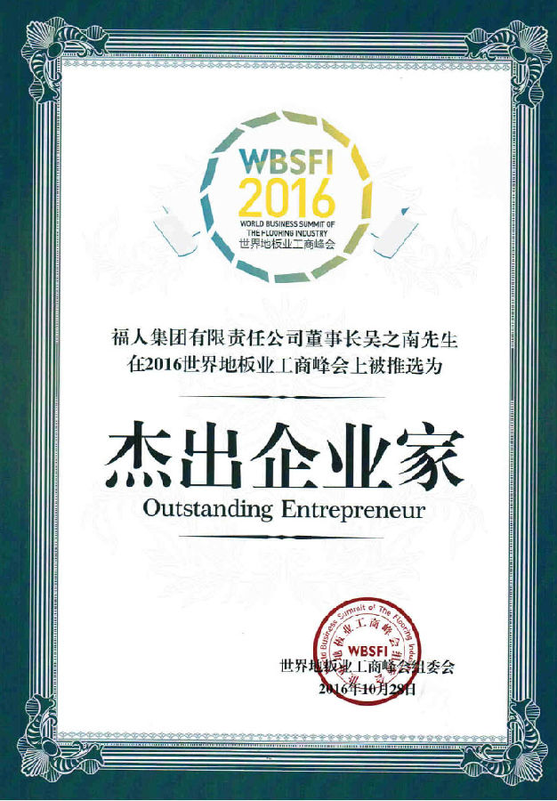 pg电子集团有限责任公司董事长吴之南先生荣获2016世界地板业工商峰会“杰出企业家”称呼。